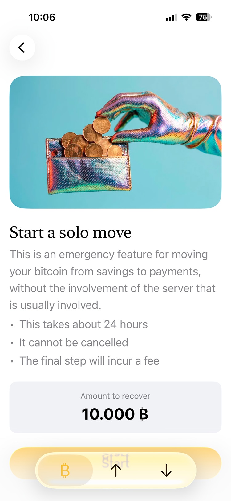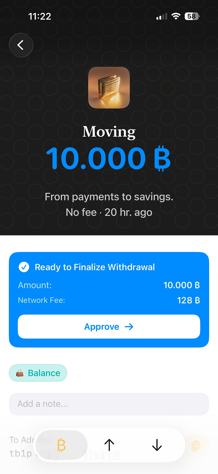 The latest step involves withdrawing the bitcoin from your payments balance to your savings balance. This step requires an additional confirmation from you at the moment (this may change).
