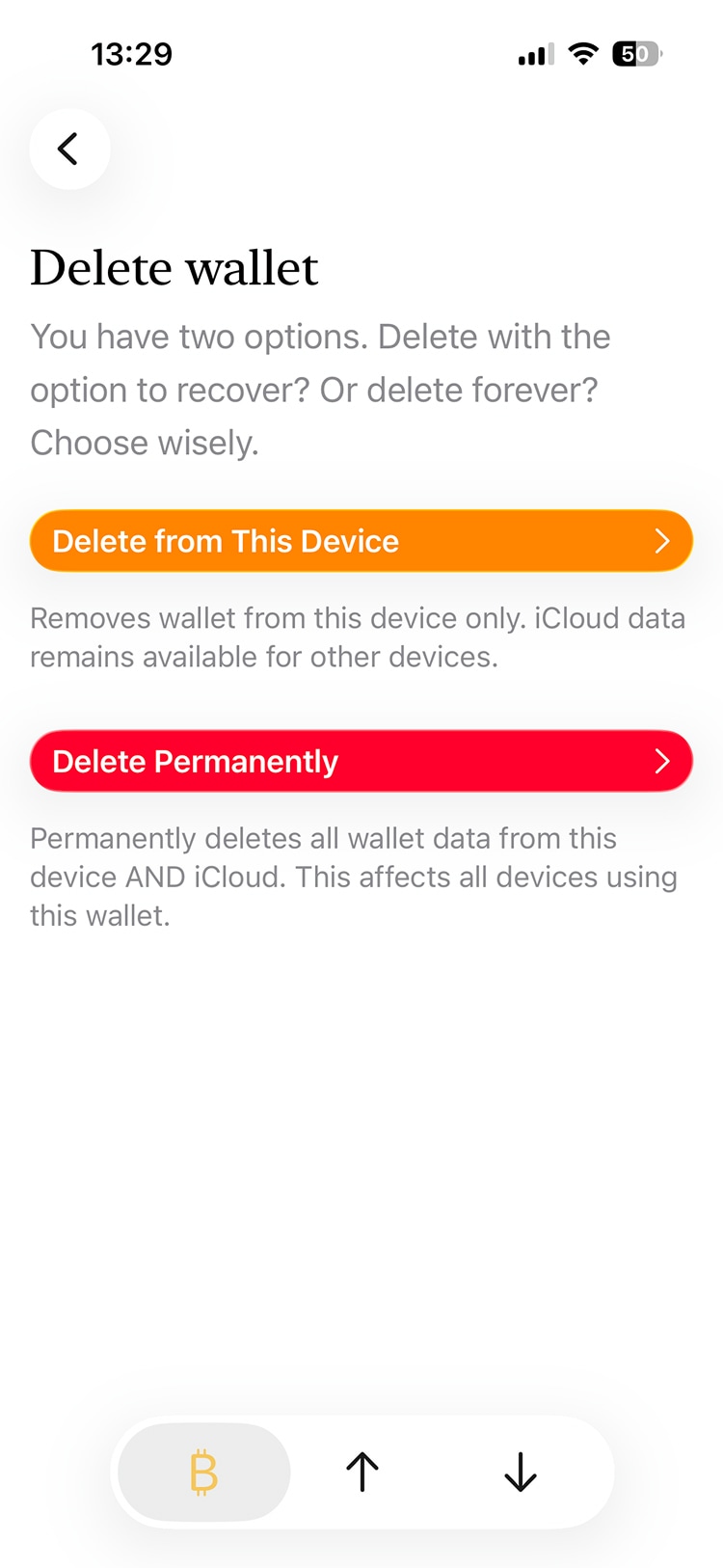 Again in Settings, navigate to Delete wallet. There are two options. Here we try the first one, to delete the wallet just from this device.