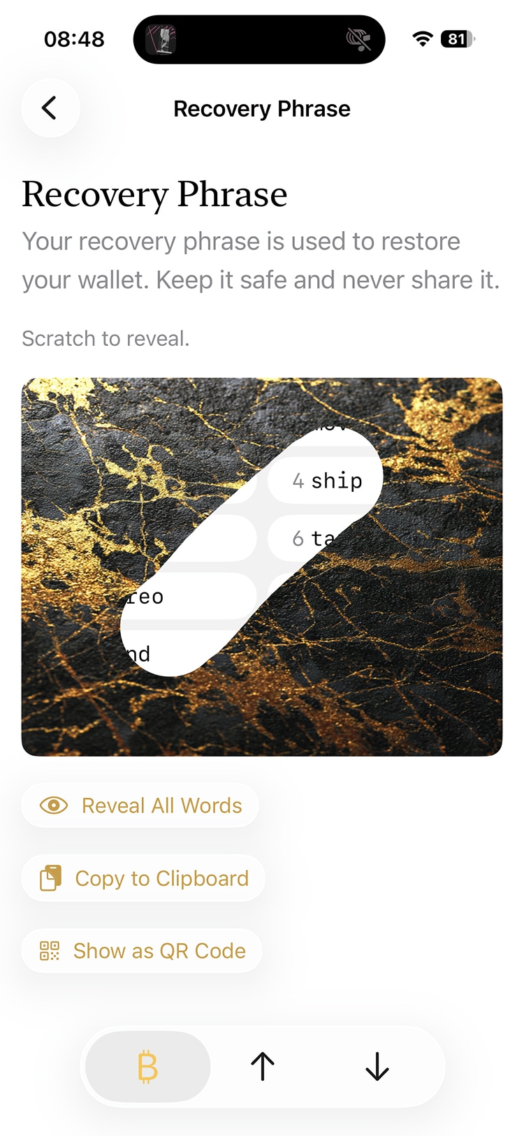 Navigate to Settings from the Activity screen, and then to Recovery phrase. Scratch off the texture to see your recovery phrase and then write it down somewhere.